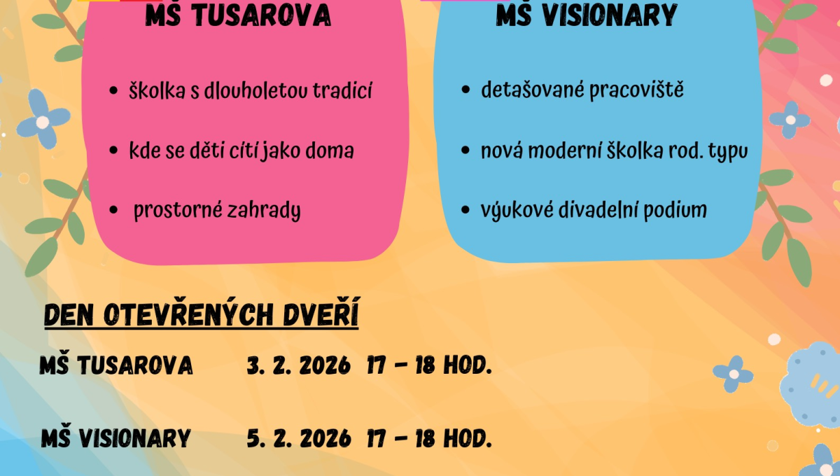 Den otevřených dveří 3.2. 2026 17 - 18h (MŠ Tusarova), 5.2.2026 17 - 18h (MŠ Visionary)