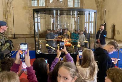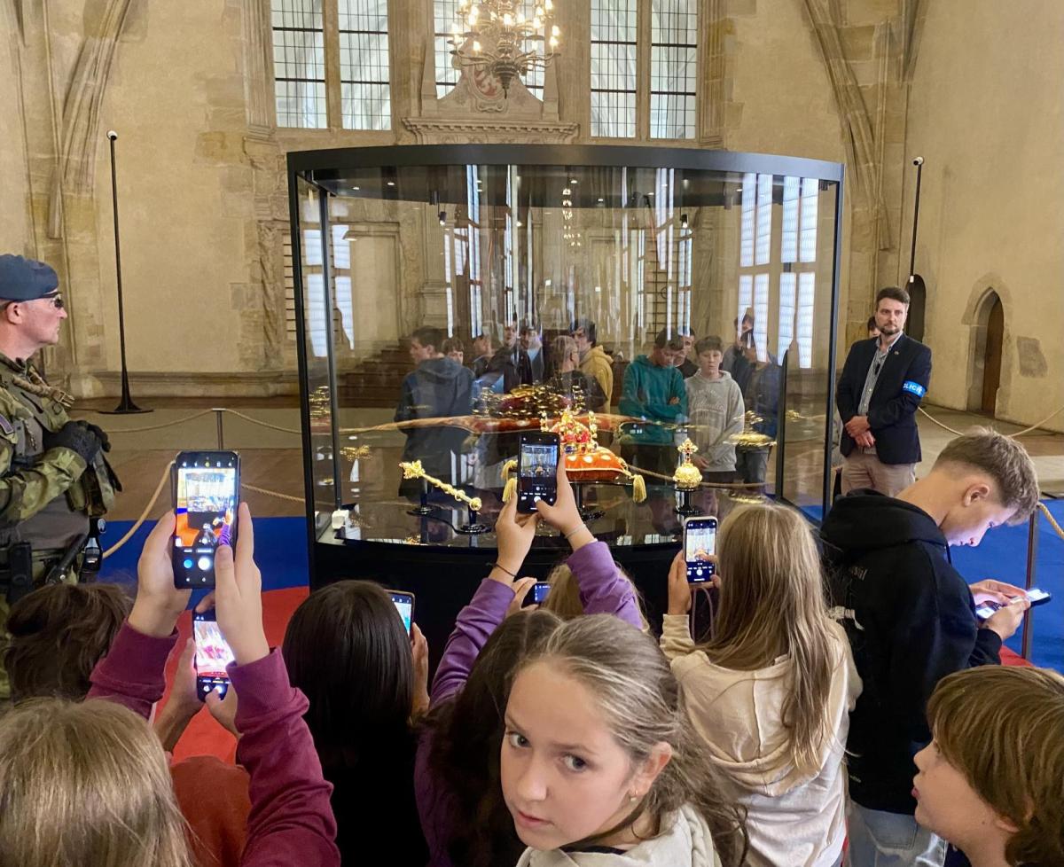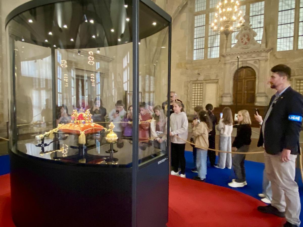 Žáci pátých tříd si v úterý 16. 9. 2025 odpoledne přesně v 16 hodin mohli prohlédnout náš národní poklad. Výstava korunovačních klenotů ve Vladislavském sále Pražského hradu Výstava s podtitulem Poklad v temnotě v souvislosti s osmdesátým výročím konce druhé světové války nás uchvátil. Vedle klenotů si žáci prohlédli i unikátní archiválie spojené s druhou světovou válkou. Také průchod bezpečnostními rámy před vstupem byl velmi napínavý a dobrodružný.